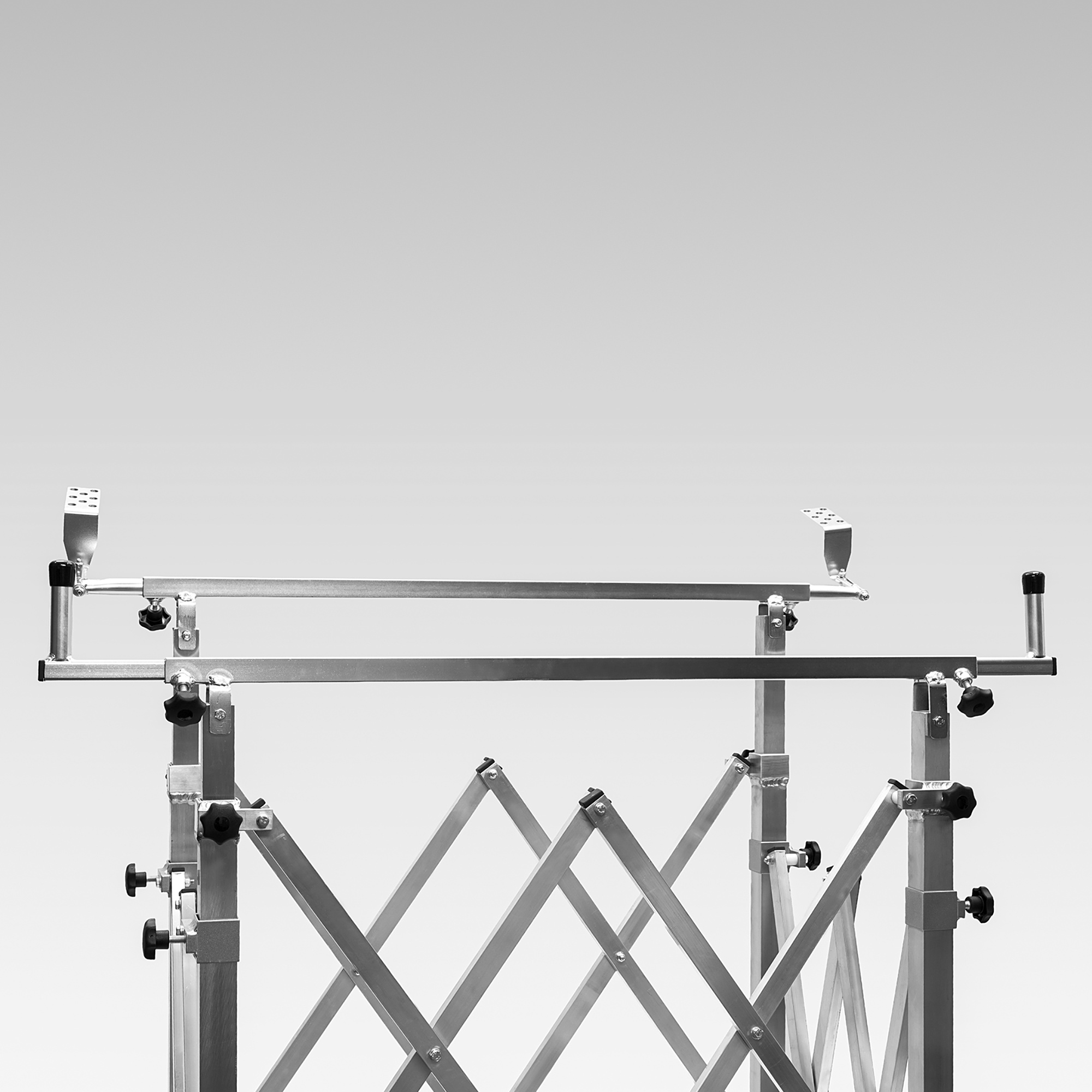 Conjunto de partes superiores para o suporte sanfona de capô dedicado a trabalhos precisos de PDR. Inclui duas barras transversais de aço, duas suportes perfurados giratórios, quatro “chifres” e duas almofadas de espuma. Permite fixar com segurança capôs e portas e posicioná-los para remoção de amassados e empurrar amassados.